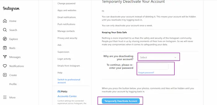 - Kamu sekarang berada di Temporarily Deactivate Your Account, Lalu isilah bagian pertanyaan Why are you deactivating your account? dan To continue, please re-enter your password lalu klik Temporarily Deactivate Account .