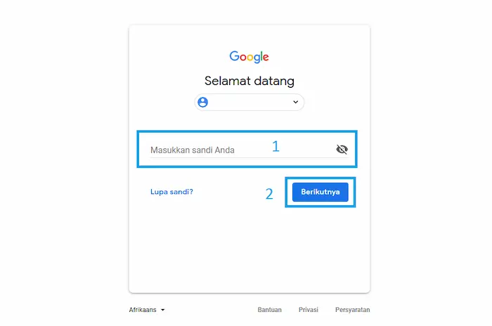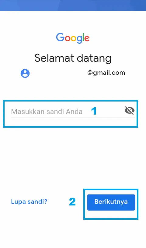 - Perlu kamu ingat bahwa yang kamu masukkan adalah sandi yang telah didaftarkan ketika mendaftar akun gmail. Kemudian klik berikutnya.